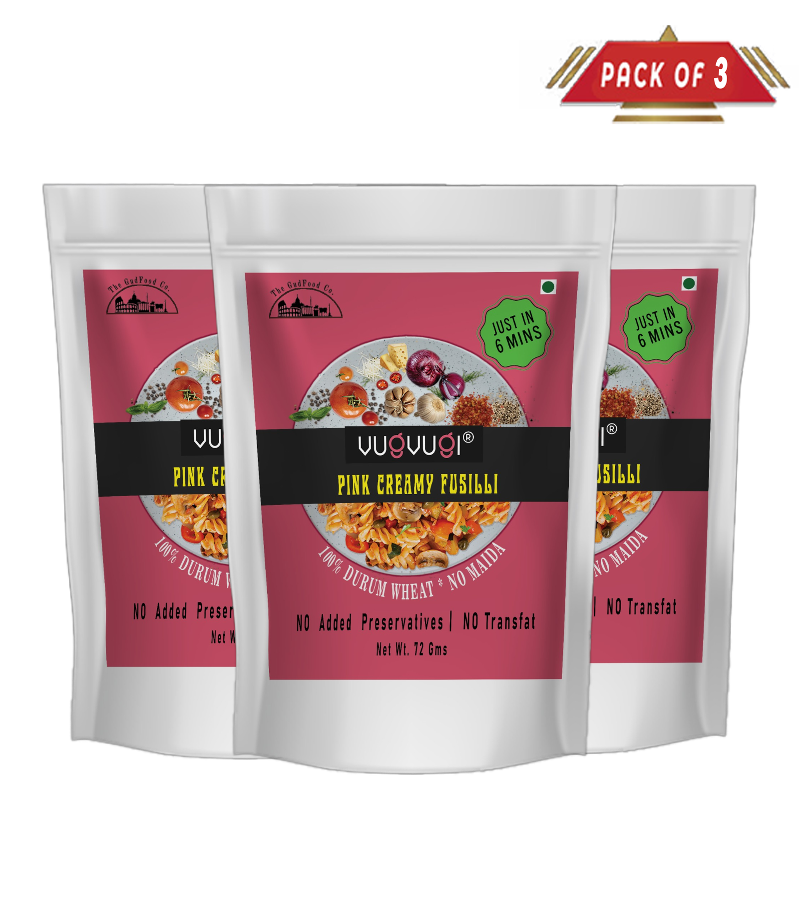 FEATURES: VUGVUGI Pink Creamy Fusilli Pasta is a tasty, single-serve meal made with natural, vegetarian ingredients. Free from preservatives, artificial colors, additives, and trans fats, it’s a wholesome choice for all ages.